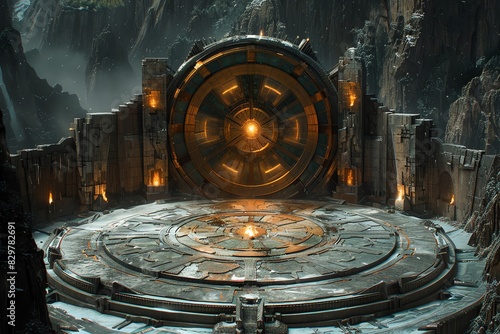 Ancient stone portal with glowing lights, set against a backdrop of a misty canyon.