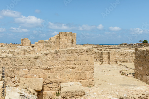 Ancient stone ruins in an archaeological site in Paphos, Cyprus.