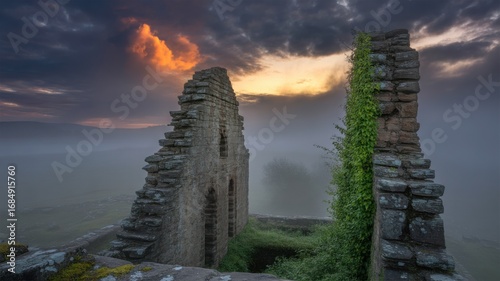 Ancient stone ruins of a castle tower overgrown with ivy under a dramatic sunset sky