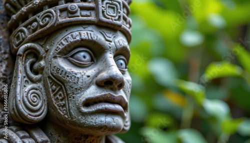Ancient stone statue depicting aztec culture jungle location close-up view nature environment historical concept