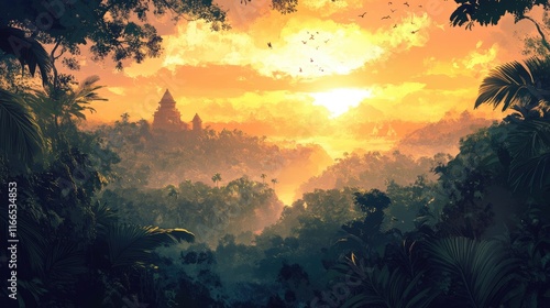 Ancient Temple Hidden Deep Within Lush Jungle At Sunset
