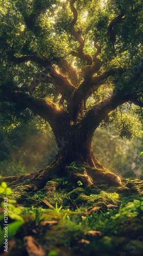 Ancient Tree in a Magical Forest: Sunlight Through Leaves