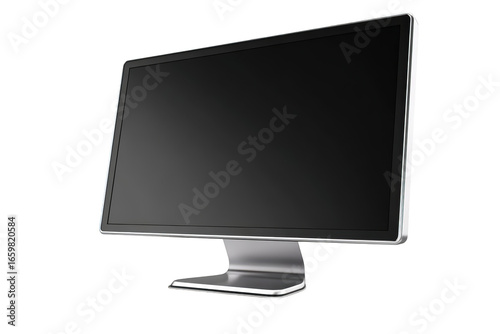 Angled silver computer monitor on black background. Screen is blank
