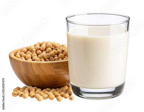 Angled View of Fresh Soy Milk in Glass with Wooden Bowl of Beans, isolated on transparent background