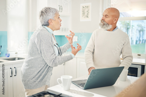 Angry, argument and a couple in a fight about an email, computer glitch or financial stress. Anger, talking and a senior man and woman speaking about a retirement problem or conflict online on a pc