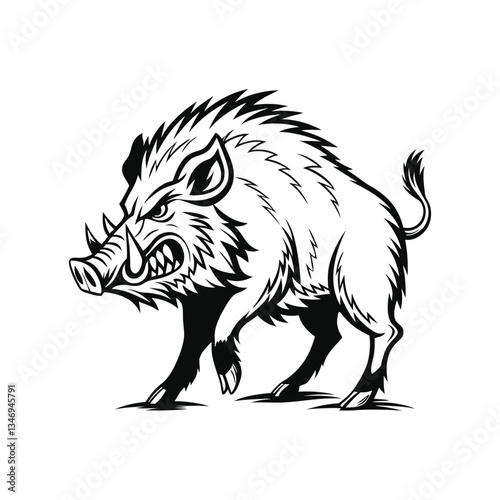 Angry wild boar vector illustration, hand drawn style, monochrome design, detailed vector, isolated on a white background