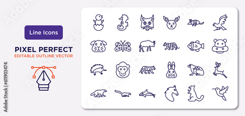 animals outline icons set. thin line icons such as chick, armadillo, wildebeest, echidna, tropical frop, orca, sable, humming bird vector.