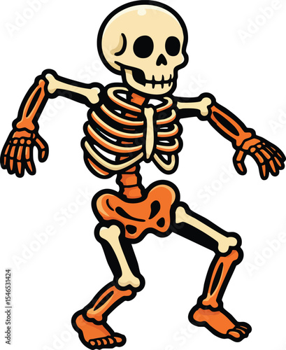 Animated dancing skeleton cartoon with orange bones and beige skull on white background for Halloween themed designs