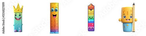 Animated shapes stand on white background, smiling and wearing fun accessories isolated on white or transparent