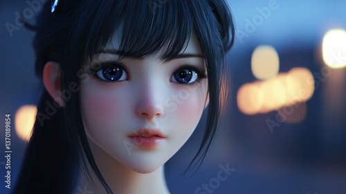 Anime Girl Portrait with Dark Hair and Big Eyes at Night