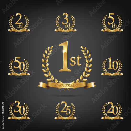 Anniversary golden symbol set. Golden laurel wreaths with ribbons and anniversary year symbols on dark background. Vector anniversary design element.