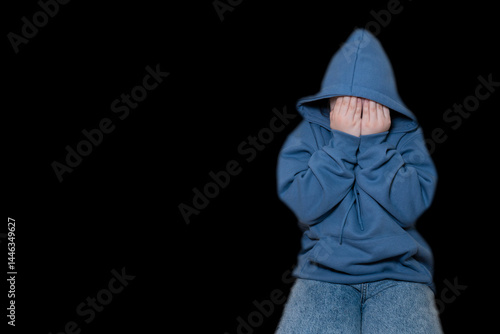 Anonymous person in blue hoodie covering face with hands. Concept of fear, shyness, or hiding identity on black background