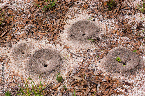 Ant nests in dry sand at Watsonvill on the Atherton Tabeland in Queensland, Australia