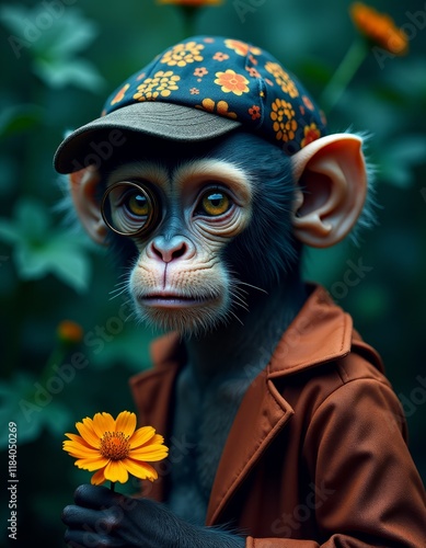 Anthropomorphic monkey dressed in a jacket, holds a flower, head and torso portrait.