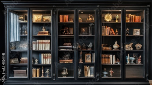 Antique bookcase filled with books, sculptures, and decorative objects.