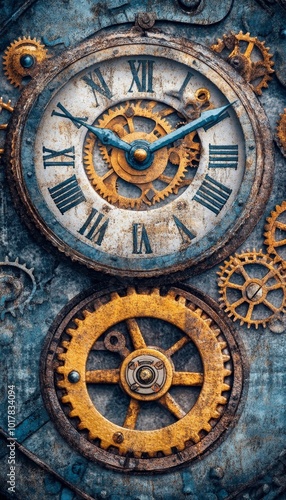 Antique Clock Face and Intricate Gears, Steampunk Background, Concept of Time and Mechanics