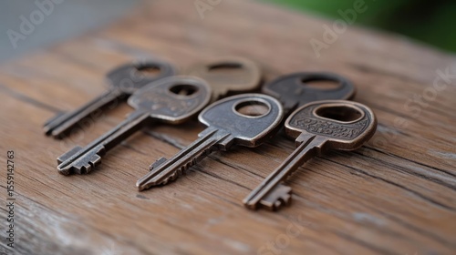 Antique Keys Arranged On Wooden Surface Showing Detailed Texture and Metallic Finish
