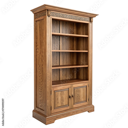 Antique wooden bookcase with carved details and double doors isolated on transparent background