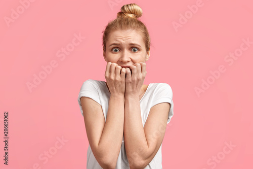 Anxious nervous blonde woman bites finger nails with anxiety, feels worried before being operated, wears casual white t shirt, poses against pink background. Lovely European female has trouble