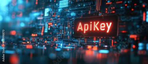 API Key glowing red on futuristic circuit board background Concept of software development, technology, cybersecurity, and data access