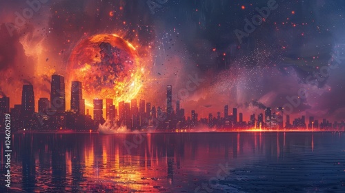 Apocalyptic cityscape at sunset with a massive fiery planet looming over a skyline