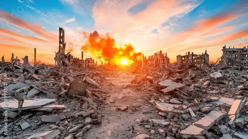 Apocalyptic ruins of a city, with fires raging among broken buildings and debris, creating a haunting, desolate atmosphere of destruction and chaos