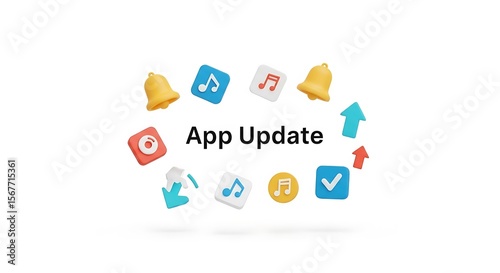 App Update Notification with Colorful 3D Icons, Software Update Concept with Various Notification Icons, Application Update and Notification System