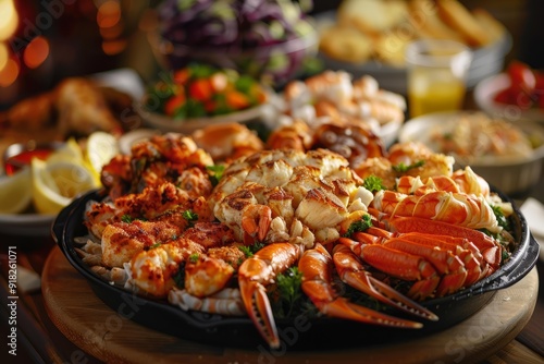 Appetizing arrangement of cooked seafood on a platter, perfect for culinary themes