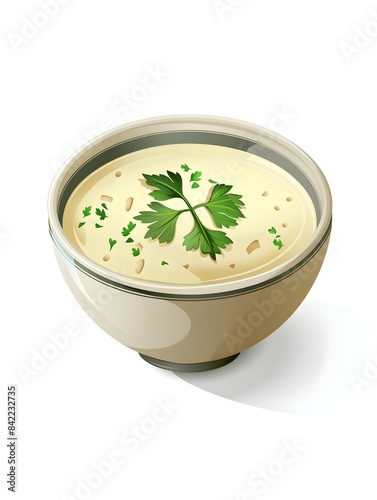 Appetizing Coconut Soup in Chibi Style with Fragrant Herbs on Isolated Background