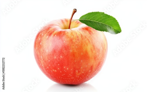 Apple on White Background – Single, fresh red apple with a glossy shine and small leaf on top, centered on a white background