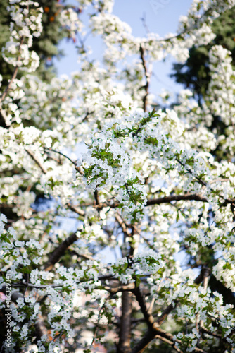 Apple tree branches in white bloom close-up