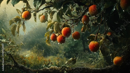 Apple tree laden with fruit, water drops clinging to ripe apples and leaves, soft countryside setting generative ai