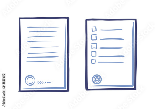 Appliance letter sample, line art icons. Paper sheet list tips, signed contract, stamp and signature vector icon isolated. Commercial documentation