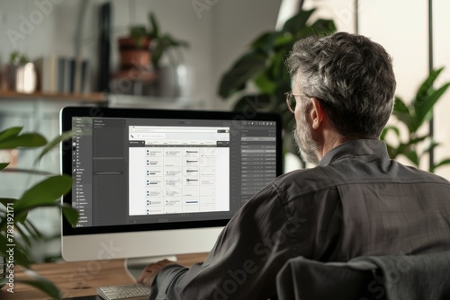 Application mockupover the shoulder shot of a adult man in front of a computer with an entirely grey screen
