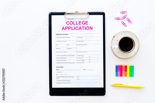Apply college. Empty college application form near coffee cup and stationery on white background top view space for text