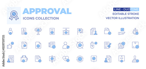 Approval icons collection. Line Duotone style, editable stroke. best practice, choose, approve, usb drive, flag, container, employee, pie chart, approval, accepted, trophy, cv, file