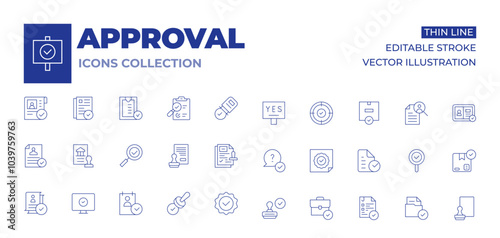 Approval icons collection. Thin Line icons, editable stroke. check, cv, banking, checking, approval, approve, quality, question, stamp, sticker, suitcase, validation, validity