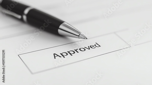 Approved stamp and pen on document, isolated on white background.