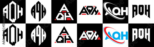 AQH letter logo design in six style. AQH polygon, circle, triangle, hexagon, flat and simple style with black and white color variation letter logo set in one artboard. AQH minimalist and classic logo