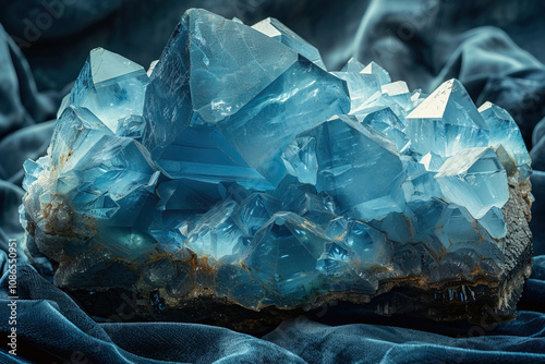 Aquamarin stone resting on elegant black velvet fabric with cinematic low key lighting