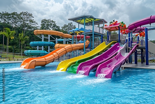 Aquapark sliders with pool. colored plastic water slides with pool in outdoor aqua park.