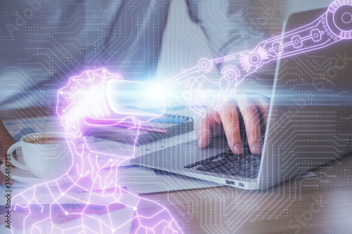 AR hologram with man working on computer on background. Augmented reality concept. Double exposure.