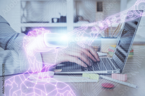 AR hologram with man working on computer on background. Augmented reality concept. Double exposure.