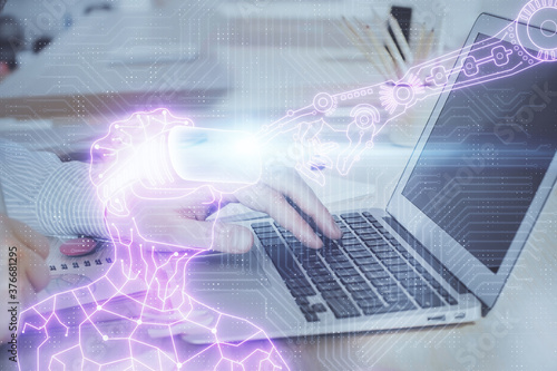 AR hologram with man working on computer on background. Augmented reality concept. Double exposure.