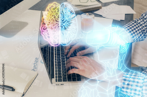 AR hologram with man working on computer on background. Augmented reality concept. Double exposure.
