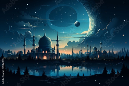 Arabian Lantern Holiday.futuristic landscape . night. a Muslim city. dark blue background. architecture. mosque, lights. Card with copy space for Ramadan and Muslim Holidays. Horizontal Frame