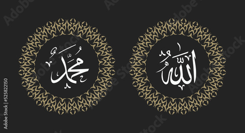 arabic calligraphy of allah muhammad with circle frame and retro color