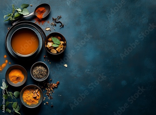 Arabic food collection on a dark blue background with copy space, flat lay top view. Stock photo contest winner, 20k, high resolution, 35mm lens, f/8. Ultra-realistic photography.
