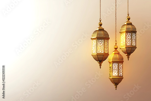 arabic lantern of ramadan celebration background, group of hanging Ramadan lanterns, white background, islamic, ramadan Kareem, eid mubarak, eid al adha, eid al fitr, 3d rendering, generative ai