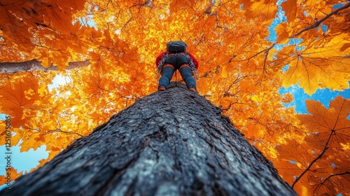 Arborist Climbing Maple Tree in Autumn for Pruning and Maintenance with Safety Gear and Clear Blue Sky